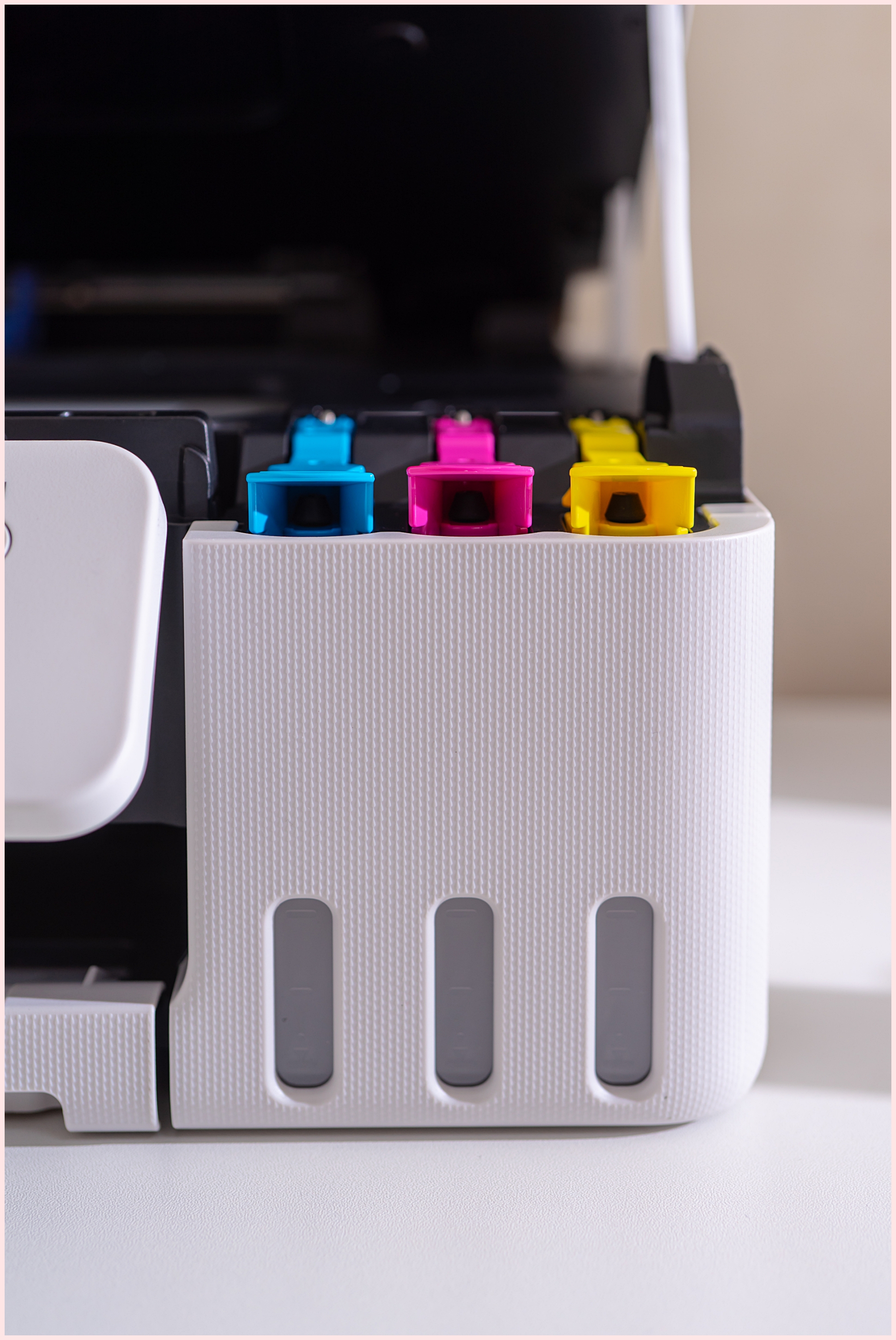 심플한 본체, 충전용 잉크, 카트리지 등이 기본 세팅되어 있으며, 노트북 옆에 배치해도 부담되지 않을 정도로 공간 효율적입니다.